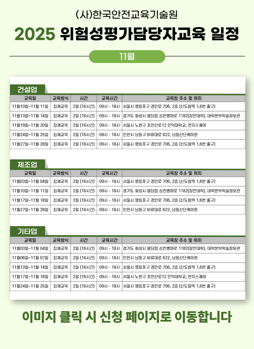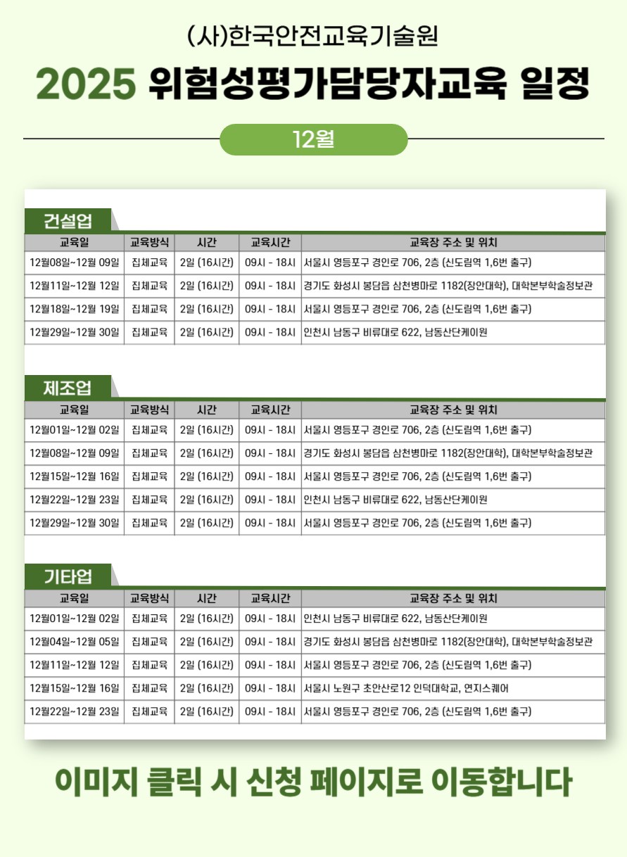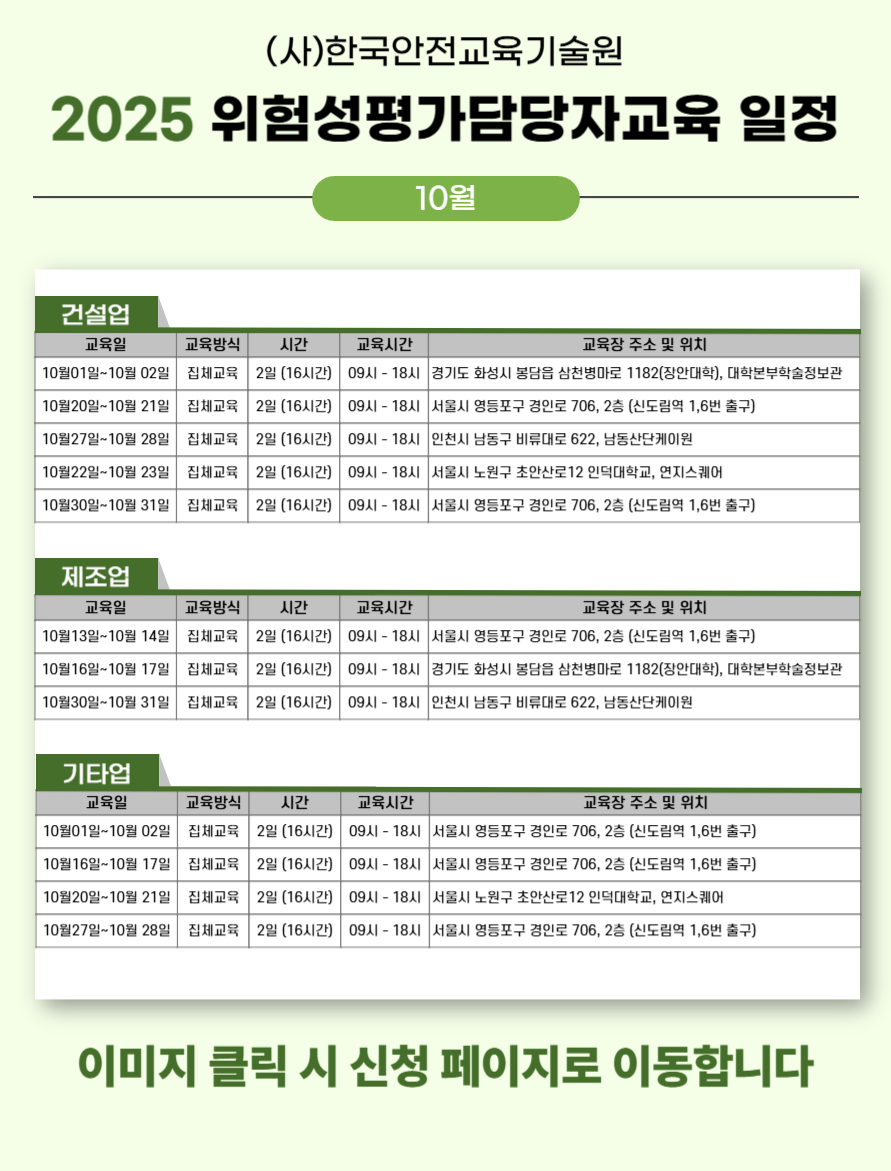 관리감독자(집체/ZOOM) 위험성평가담당자 안전보건관리책임자 안전관리자 안전관리전문기관종사자 건설재해예방기관종사자 보건관리자 보건관리전문기관종사자